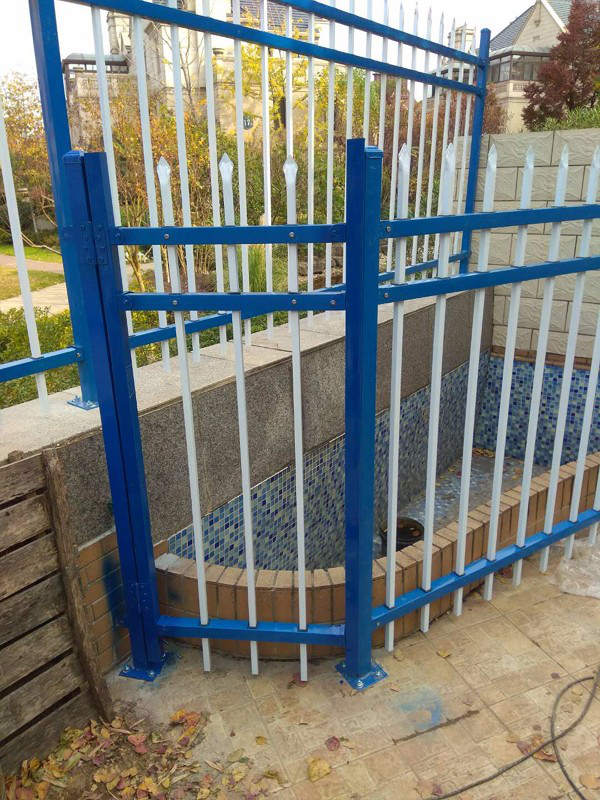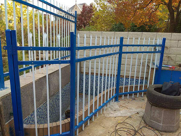 下面的照片是南京仙林一個別墅區的私家庭院四周安裝使用的鋅鋼護欄圍欄。客戶選用的三橫桿鋅鋼護欄,立柱和橫桿都是噴塑寶藍色,豎桿選擇的是白色。這批鋅鋼護欄的立柱采用膨脹螺栓于地面連接固定。